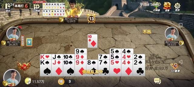 想引对手先出牌,就还个小 4、小 5 这种小牌。等他出小的,你立马顺子、三带一压上去,慢慢把他牌耗干。