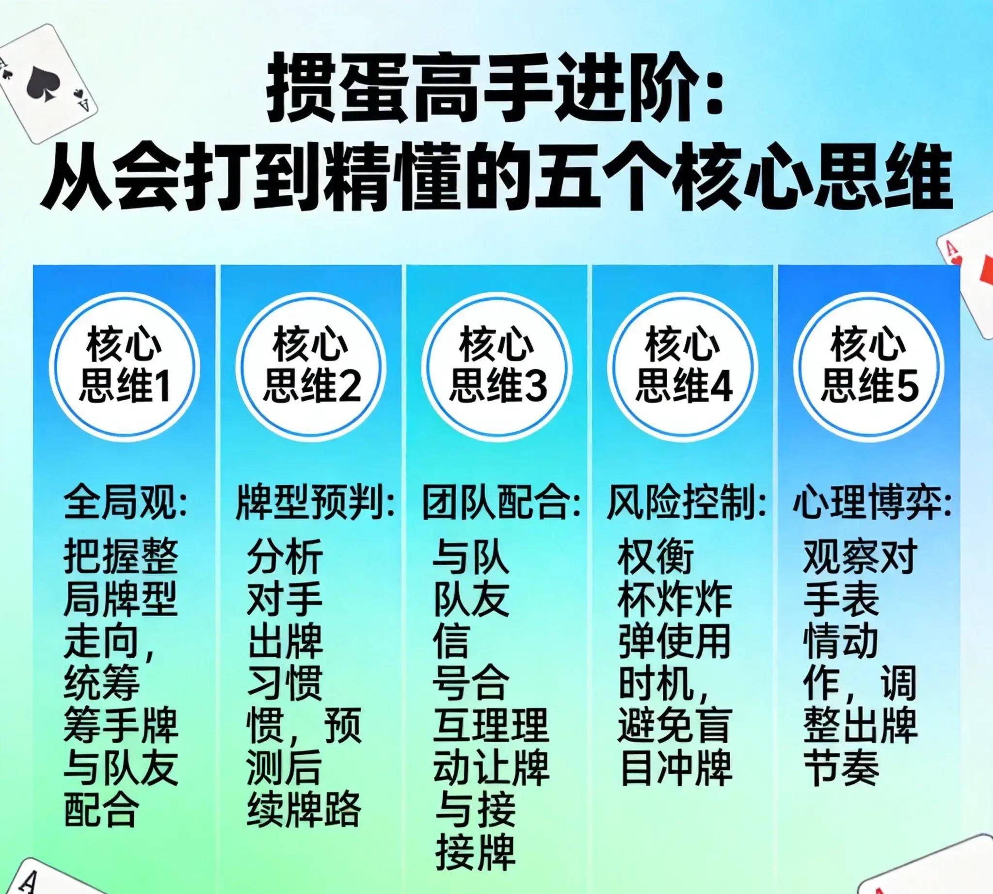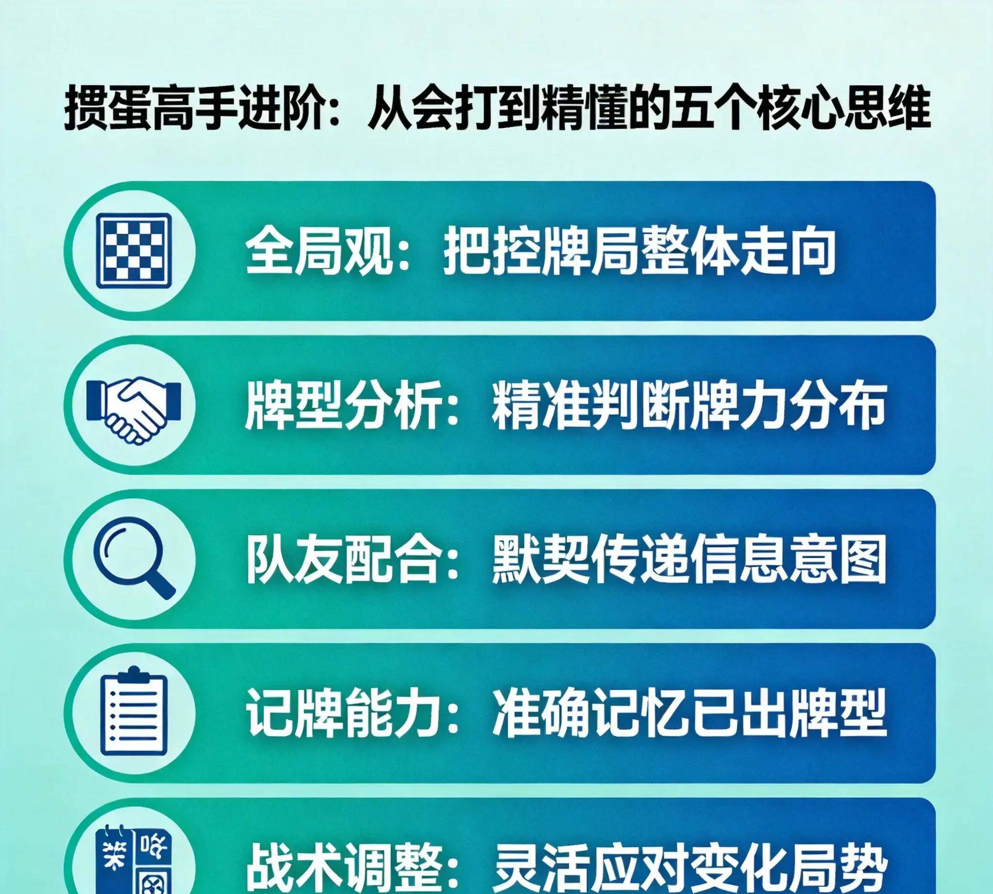 掼蛋不只是纸牌的对抗,还是心理上的较量。高手很会从对手的表现里找信息。他们会根据对手在重要时候的反应,判断他们的牌型和策略。对手的小动作、出牌顺序,甚至表情,都会被高手留意到,变成有用的信息,帮助自己做下一步的决定。通过这种细致的分析,他们既能规划好自己的打法,还能打乱对手的节奏,让自己有心理优势。