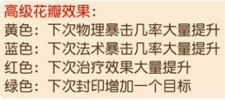 例如得到绿色高级花瓣时,一笑倾城就可以实现四封,得到红色高级花瓣时,递花魂的治疗效果更为强烈