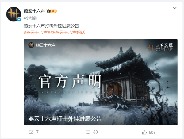 另一方面,除上述案件外,《燕云十六声》上线近一年来,运营团队还对使用外挂行为,保持了高压打击态势。