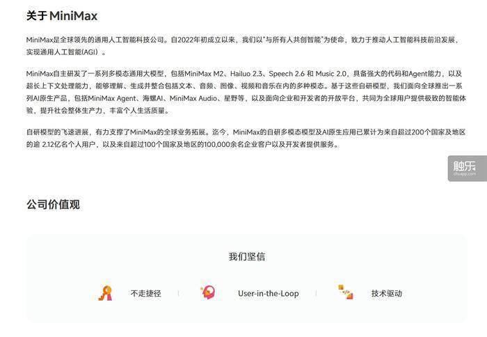 公开资料显示,MiniMax于2021年6月30日注册成立,是一家全模态AI公司,基于自研大模型打造覆盖B端、C端的AI原生产品矩阵,包括海螺AI、Talkie、星野等,同时也为企业用户和开发者提供开放平台服务。