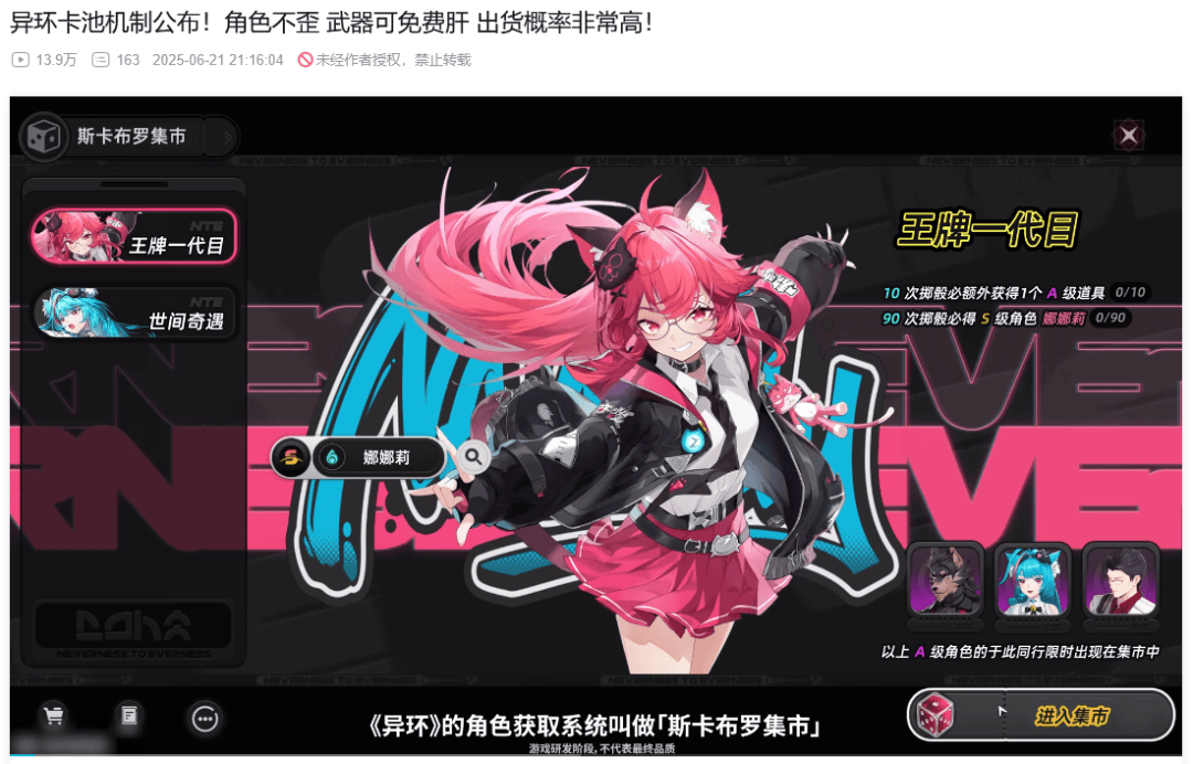 比如《异环》二测时,不仅宣布游戏“永不歪卡”,而且“双重保底”(强制线+大保底)和“棋盘变格”机制还进一步提高了玩家的抽卡期望。
