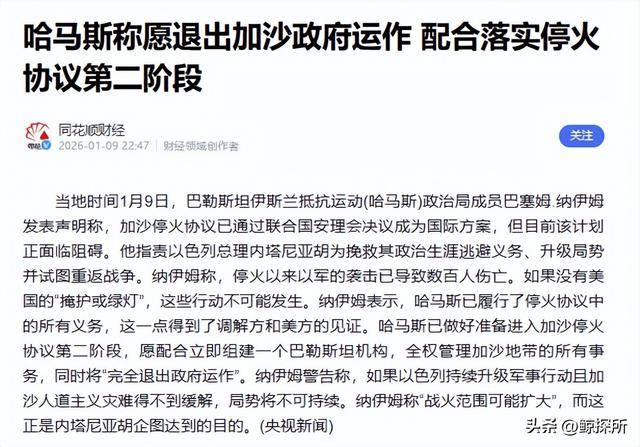 再硬撑下去别说对抗以色列,可能连民众的信任都保不住了,这也是为什么1月9日哈马斯政治局成员巴塞姆·纳伊姆会提前放话。