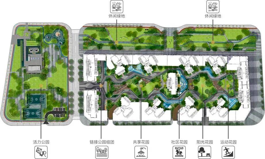 我们将土地重新赋能,无界公园由外而内延伸至住宅区,从活力运动公园到氧气客厅花园、阳光庭院花园等组成的中轴景观组团,每一步归家路,都是风景丛生的人生花路。