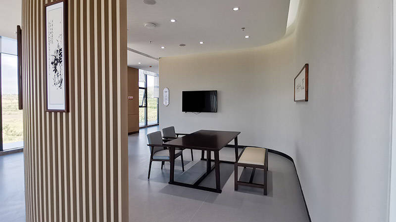 设施配套方面,社区秉持“适老化、生态化、智能化”的理念,打造舒适、便捷、安全的居住空间。社区内设3万平方米生态公园,植被繁茂、空气清新,园内铺设休闲步道、设置休息座椅,是长者日常休闲散步、邻里交流的绝佳场所;同时毗邻多座城市公园,进一步丰富了长者的休闲空间。体验中心总面积达4198平方米,内设样板间、影音厅、健康管理区等多种功能区域,细节之处融入中式文化元素,彰显雅致格调。社区规划有70㎡、40㎡、32㎡等多种户型,所有户型均采用全方位的适老化设计,卫生间配备扶手、无高差淋浴,家具采用圆角设计,配备应急电源和起夜灯,衣柜设置下拉衣杆,橱柜采用地柜内退设计,部分户型还设置了轮椅收纳区和护理床,适配不同长者的居住需求。